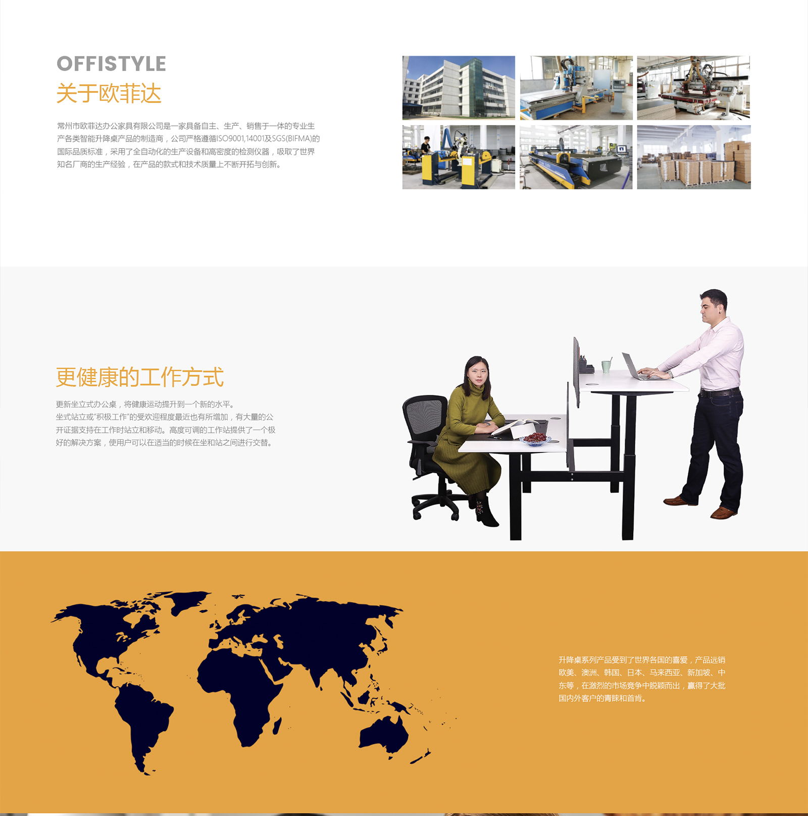 常州市歐菲達辦公家具有限公司是一家具備自主、生產、銷售于一體的專業生產各類智能升降產品的制造商。公司生產的符合人體工學的升降桌系列和智能家居等受到了世界各國的喜愛,產品遠銷海外市場。